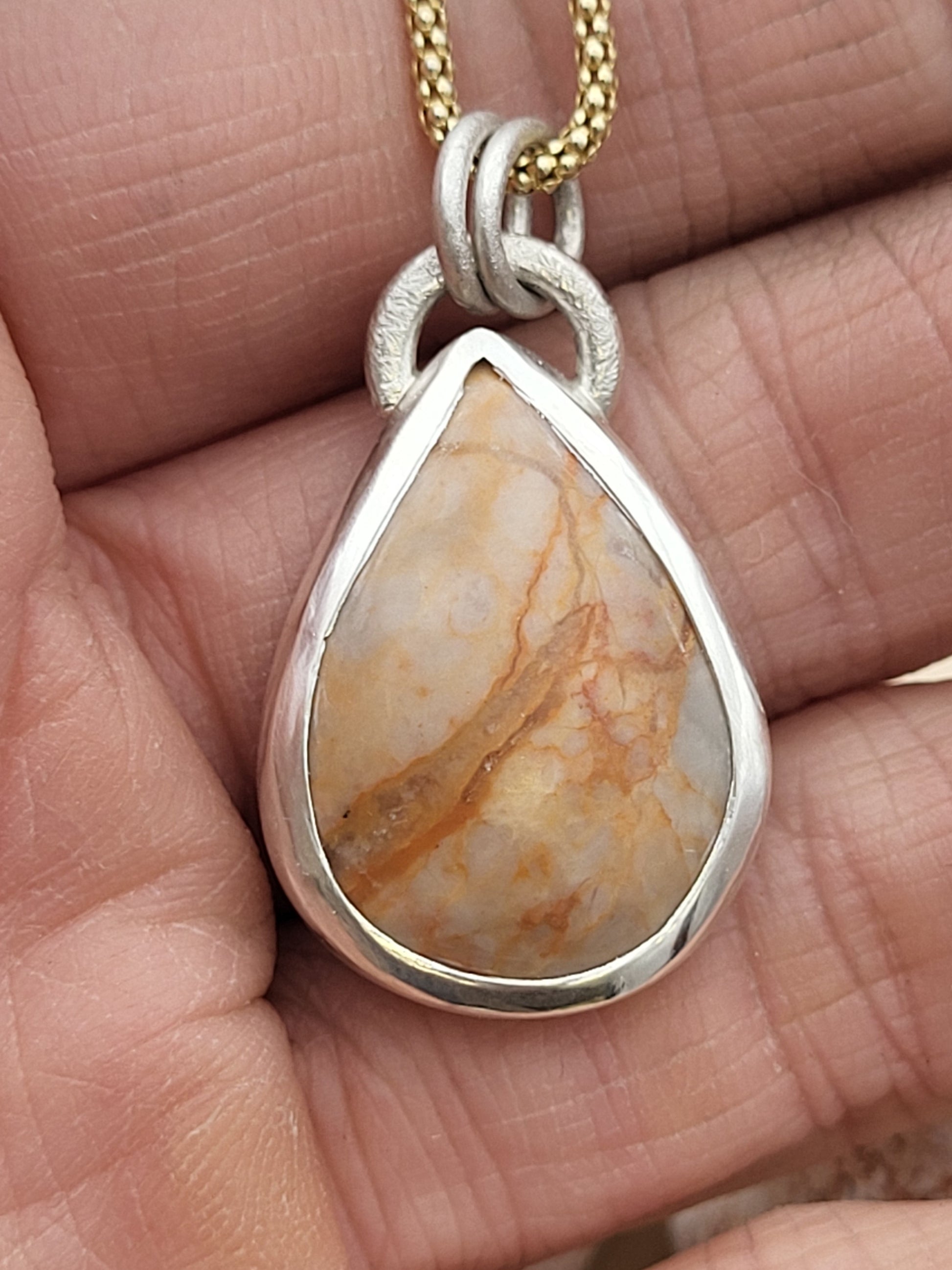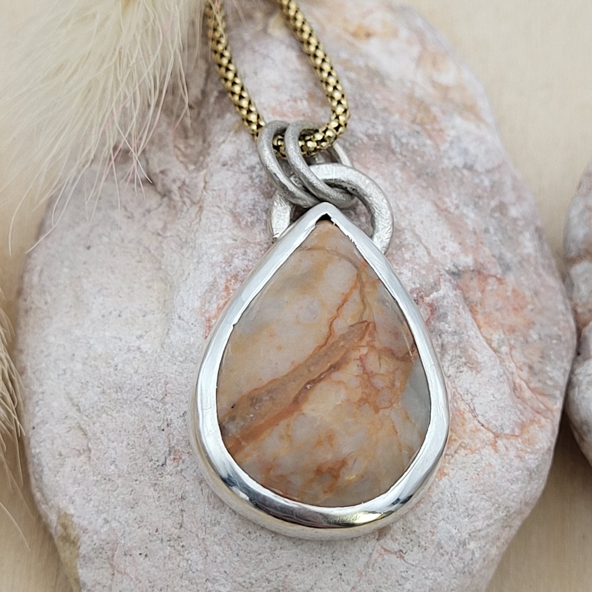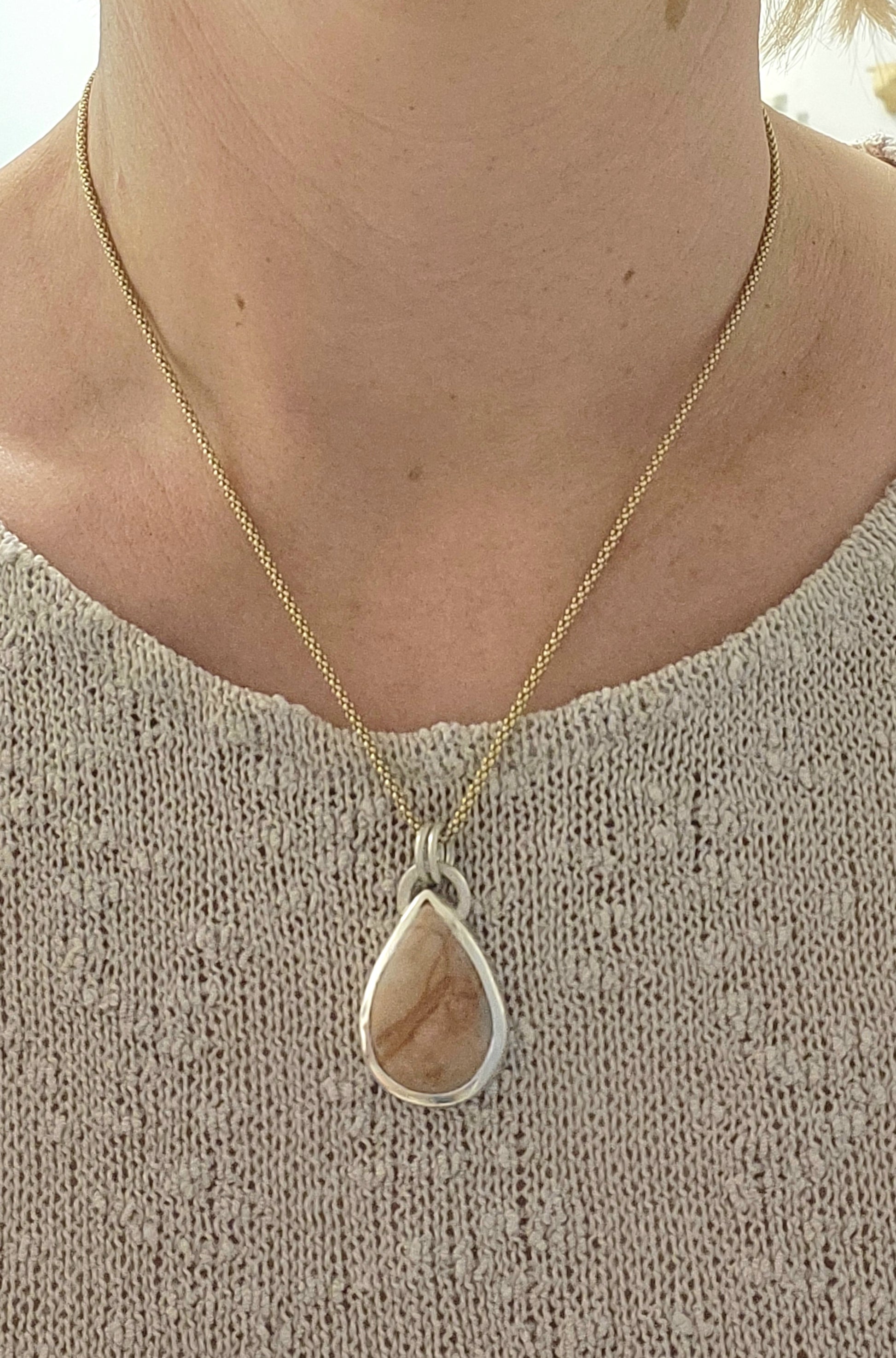 Dieser Anhänger ist ein Stück Gebirge – roh, zart, erdig. Der tropfeiförmige Stein wurde in der Höllentalklamm am Fuß der Zugspitze gefunden, behutsam von Hand geschliffen und in feiner Handarbeit gefasst. Seine Oberfläche zeigt warme Prosatöne, von sanftem Grau bis ins bräunlich-erdige Spektrum – ein stiller Dialog zwischen Fels, Wasser und Zeit.