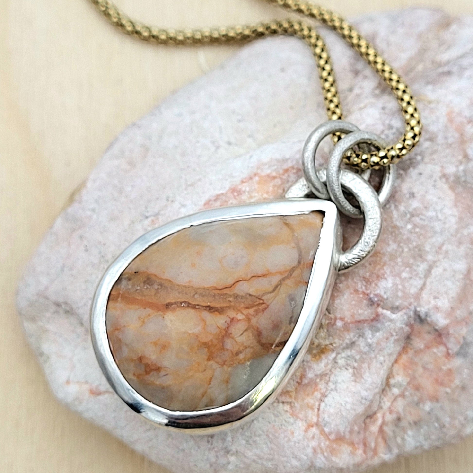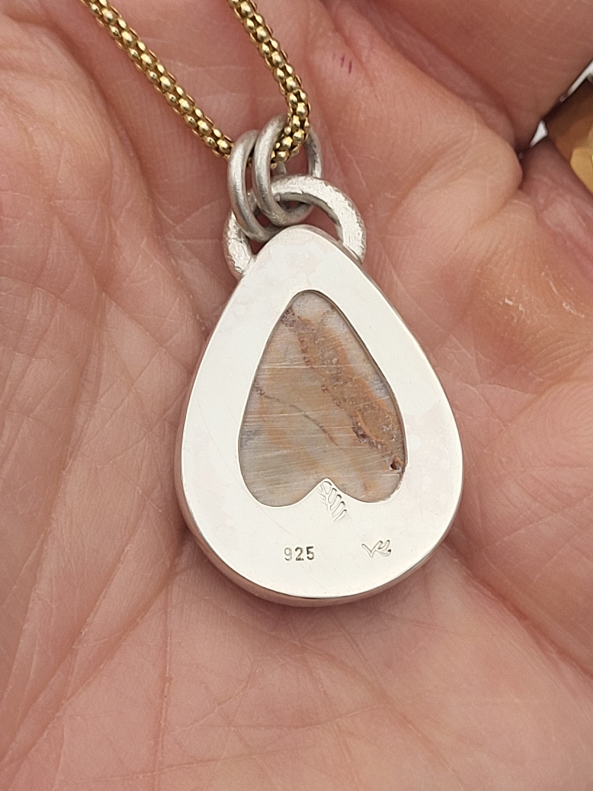 Die Rückseite trägt einen ausgeschnittenen Bereich in Form eines umgedrehten Herzens – so liegt der Stein direkt auf der Haut, ganz nah, fast wie ein Talisman. Der Anhänger verbindet Natur und Mensch auf leise, kraftvolle Weise.