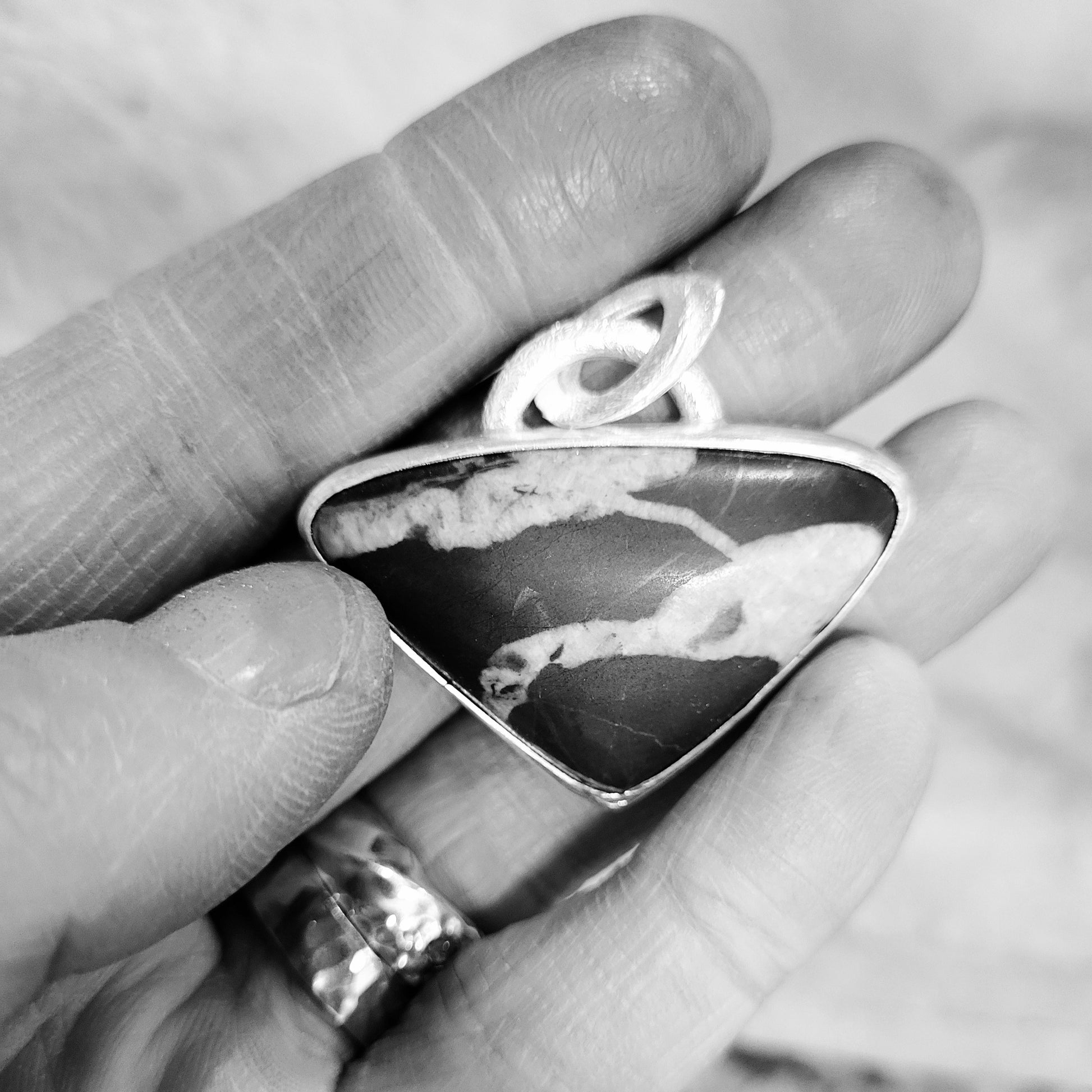 Die Form ist schenkelsymmetrisch – ein Dreieck mit zwei gleich langen Seiten, wobei die längste Seite oben liegt. Genau dort sitzt ein besonderer, individuell gefertigter Aufhänger, der dem Stein Raum lässt und seine Geometrie elegant betont. Durch diese ungewöhnliche Hängung entsteht beim Tragen ein feines, natürliches Schaukeln, das den Stein leicht in Bewegung hält – lebendig, ohne unruhig zu sein.