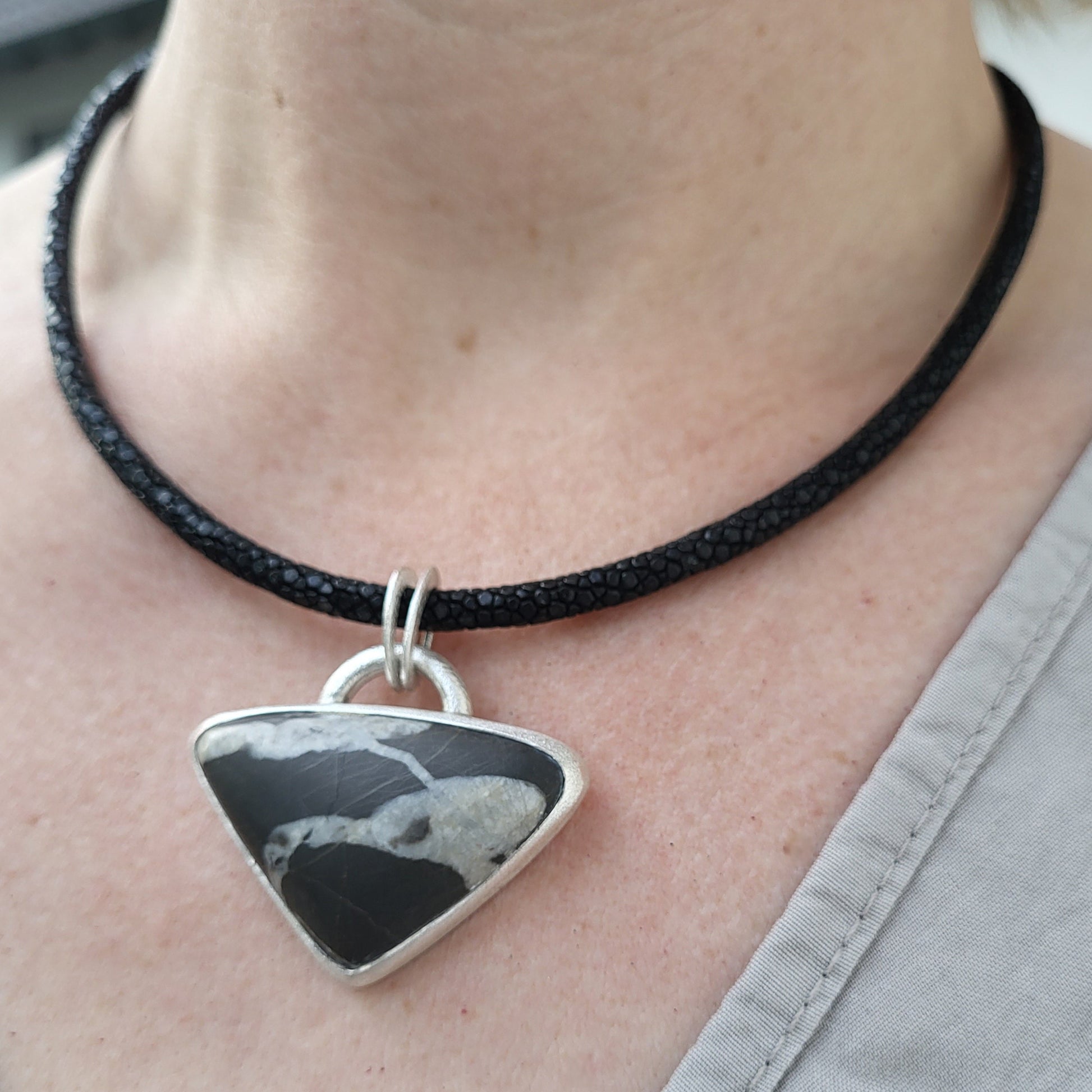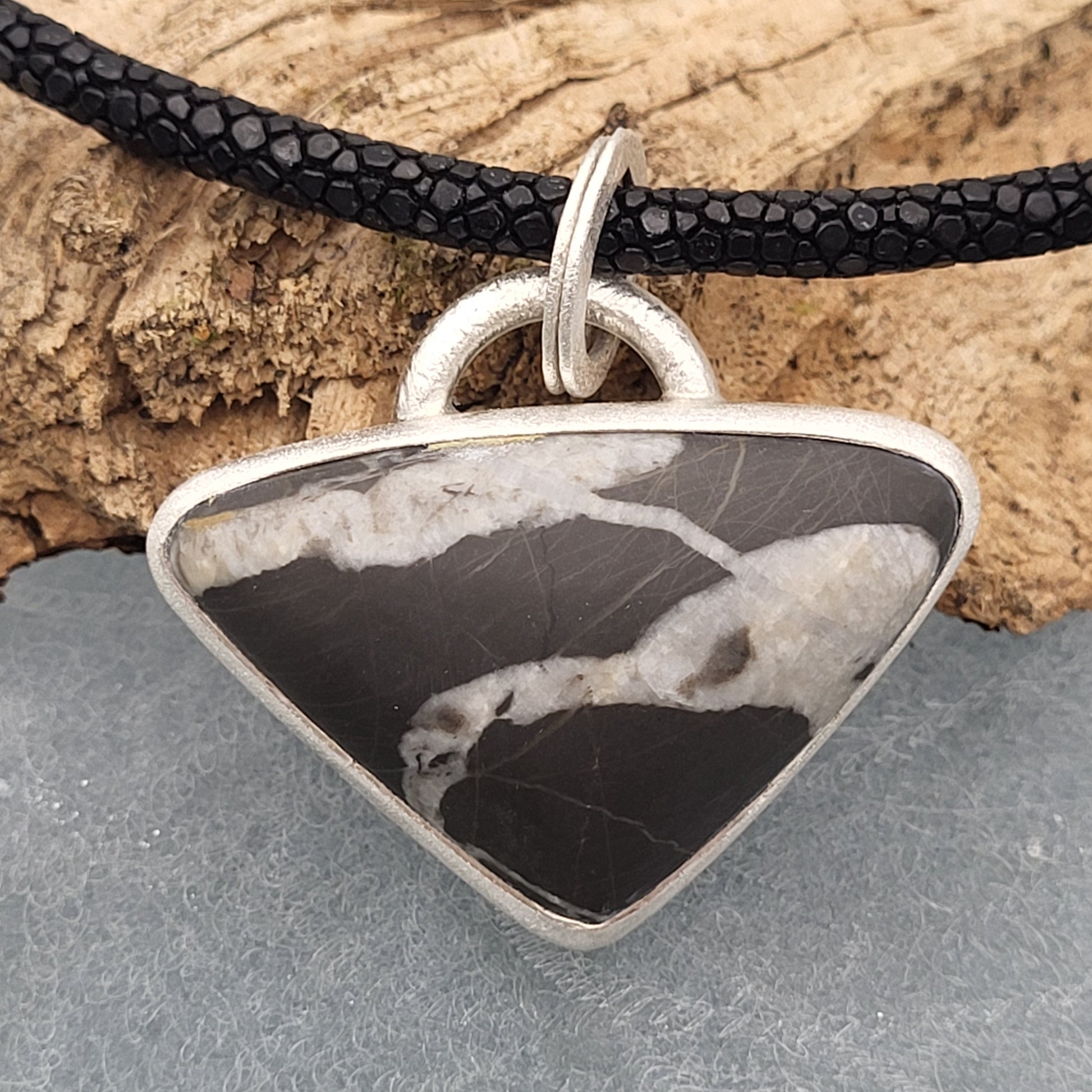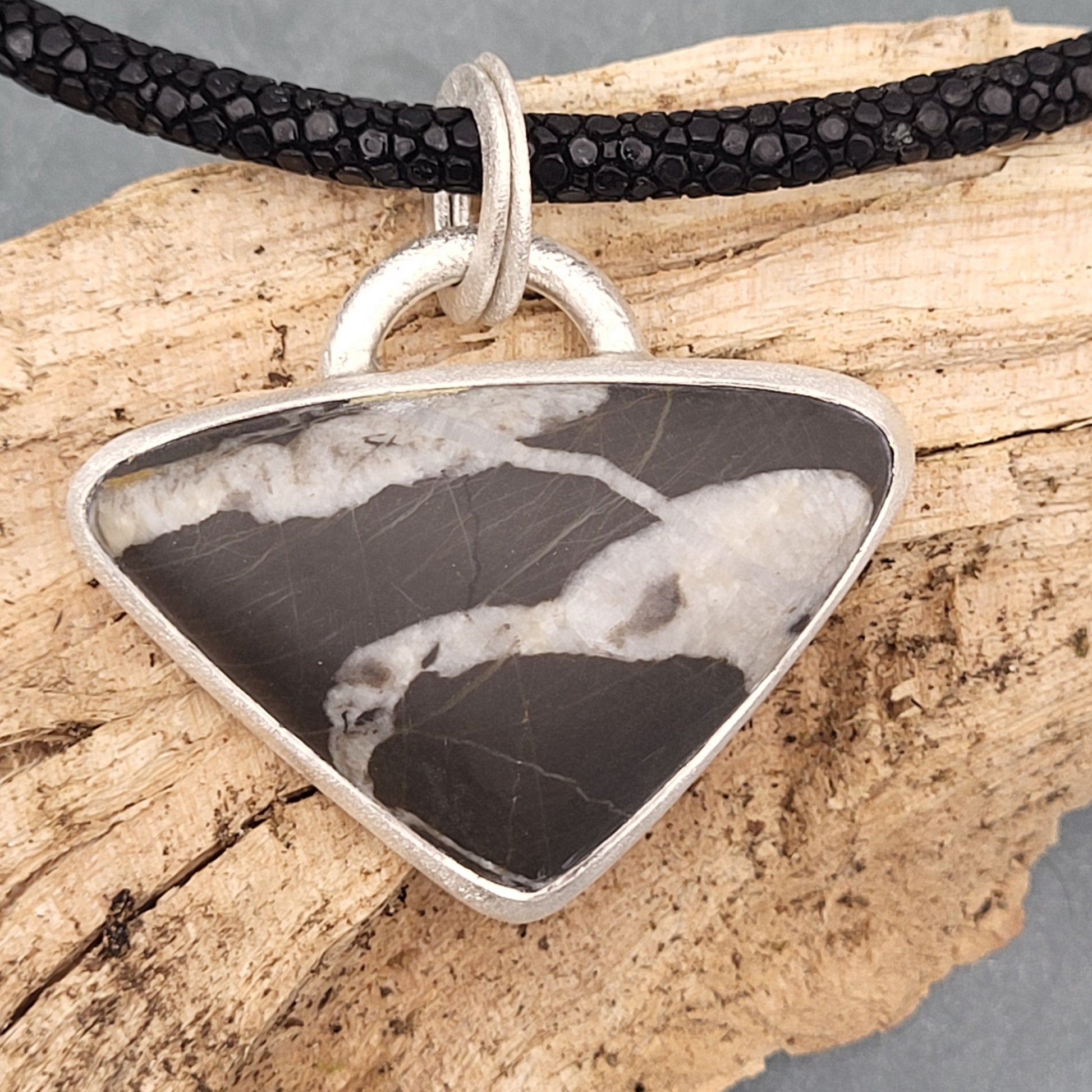 Anhänger „Linie“ – Schwarzer Dreieckstein an Rochenleder-Collier